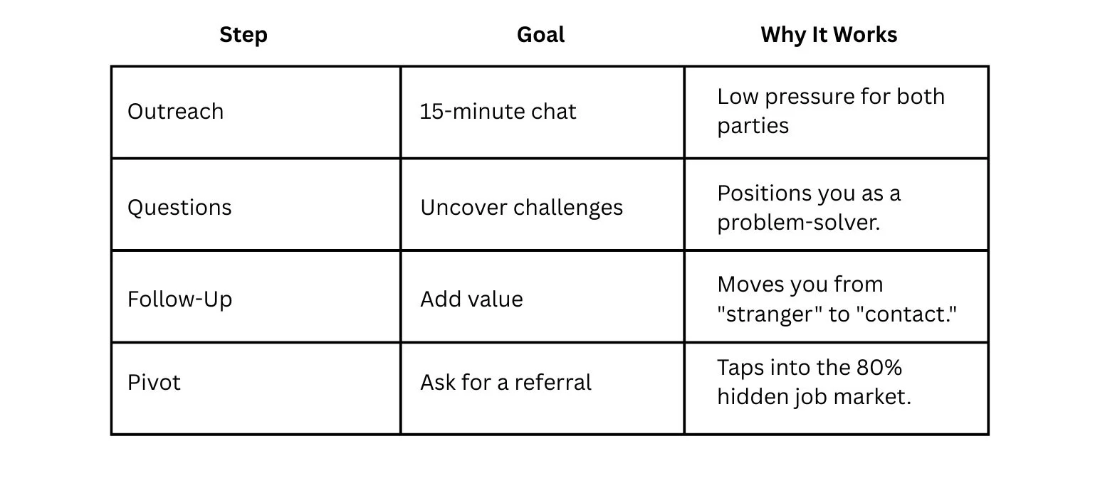 We know that up to 80% of roles are never posted on a job board. They are filled by people who were already "in the room" or fresh in a manager’s mind. In a world of AI-optimized resumes, a 20-minute human conversation is the ultimate way to prove your edge is real.